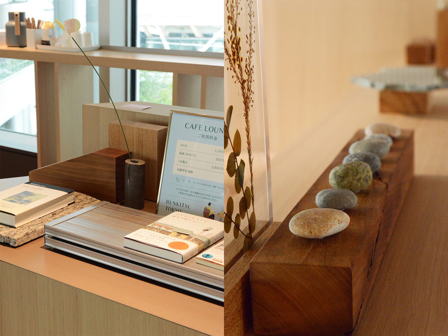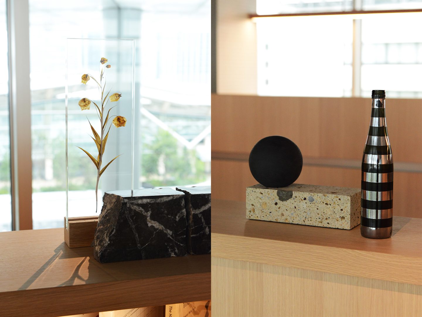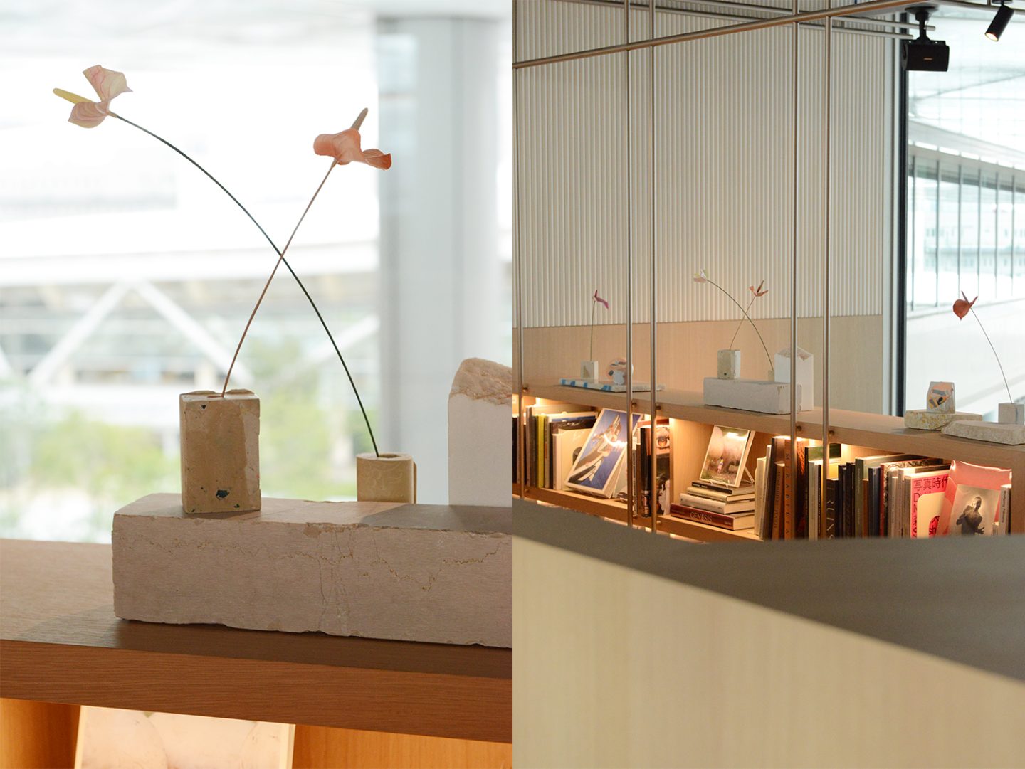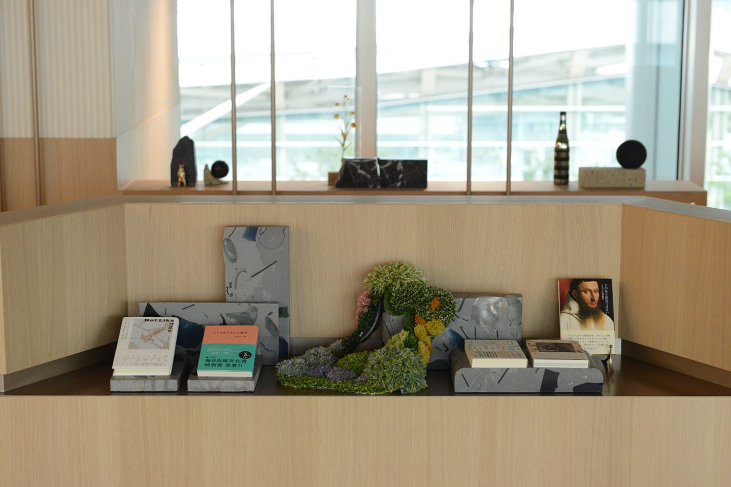 本棚の上であったり、テーマに沿って選書されたコーナーや受付周りなど10ヶ所以上に及ぶスペースのディスプレイを担当。文喫としても挑戦的な陳列の方法を試みており、ただきれいに本棚に収まるという陳列方法ではない見せ方を模索、実験しているそうだ。その中でAtelier maticはオブジェなどで空間を彩る役割を担った。