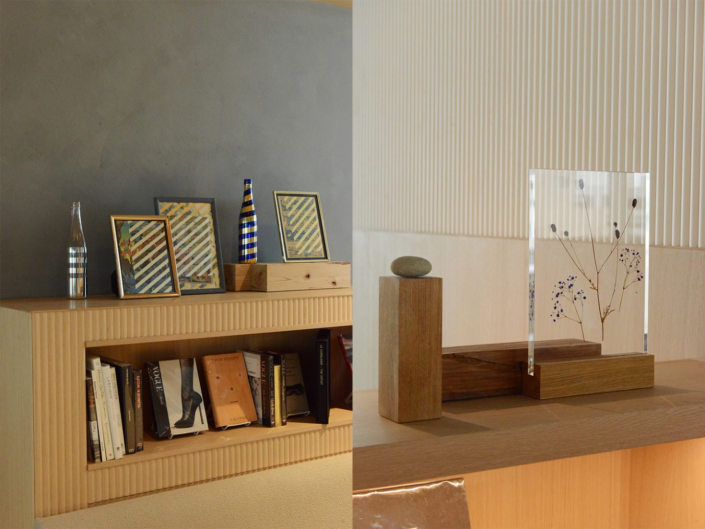 以前に石好きの友人との会話の中で、石ころをインテリアに取り込む際に、その石は「飾る」のか、「置く」のか、意識的に飾るのか、無意識にただ置くのか、という話になったことがある。それ以来、しばしばそのことについて考えるのだが、今回は明らかに「飾る」という依頼と行為である。きれいに成形されていない大理石のブロックや、何でもない石ころを木の上に並べてみたり、どこかゆるさを感じられるように心がけ、「置くように飾る」、「さりげなく飾る」ということを意識して構成していった。
