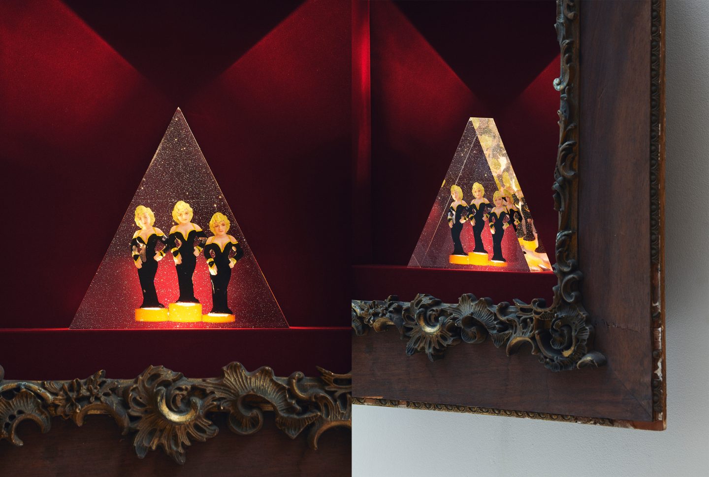照明を仕込んだ額を壁に埋め込み、アクリル作品を展示。マリリンモンローのようなフィギュアが3人ラメの降り注ぐアクリルの中でステージ上で歌っている。なんだこれは、的な作品ですが、アクリルの中と外の額縁や大きなボックス含めてひとつの作品なのである。これだけのスペースをとって、飾るものはたった一点。リッチなマリリンモンローだ。その余白が今回はとても重要でした。