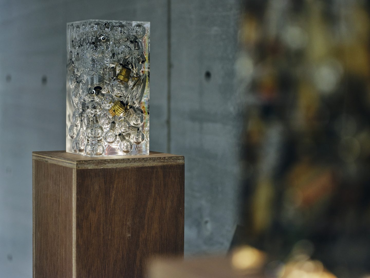 Incandescent bulbs, now rarely used. What once illuminated others now becomes the illuminated subject within acrylic, still functioning. The mirrored surfaces of the sockets beautifully reflect adjacent bulbs, creating a mysterious, layered visual impression. Other works include a series featuring cubes filled with small items collected at antique markets, dried flowers, and paint tubes.