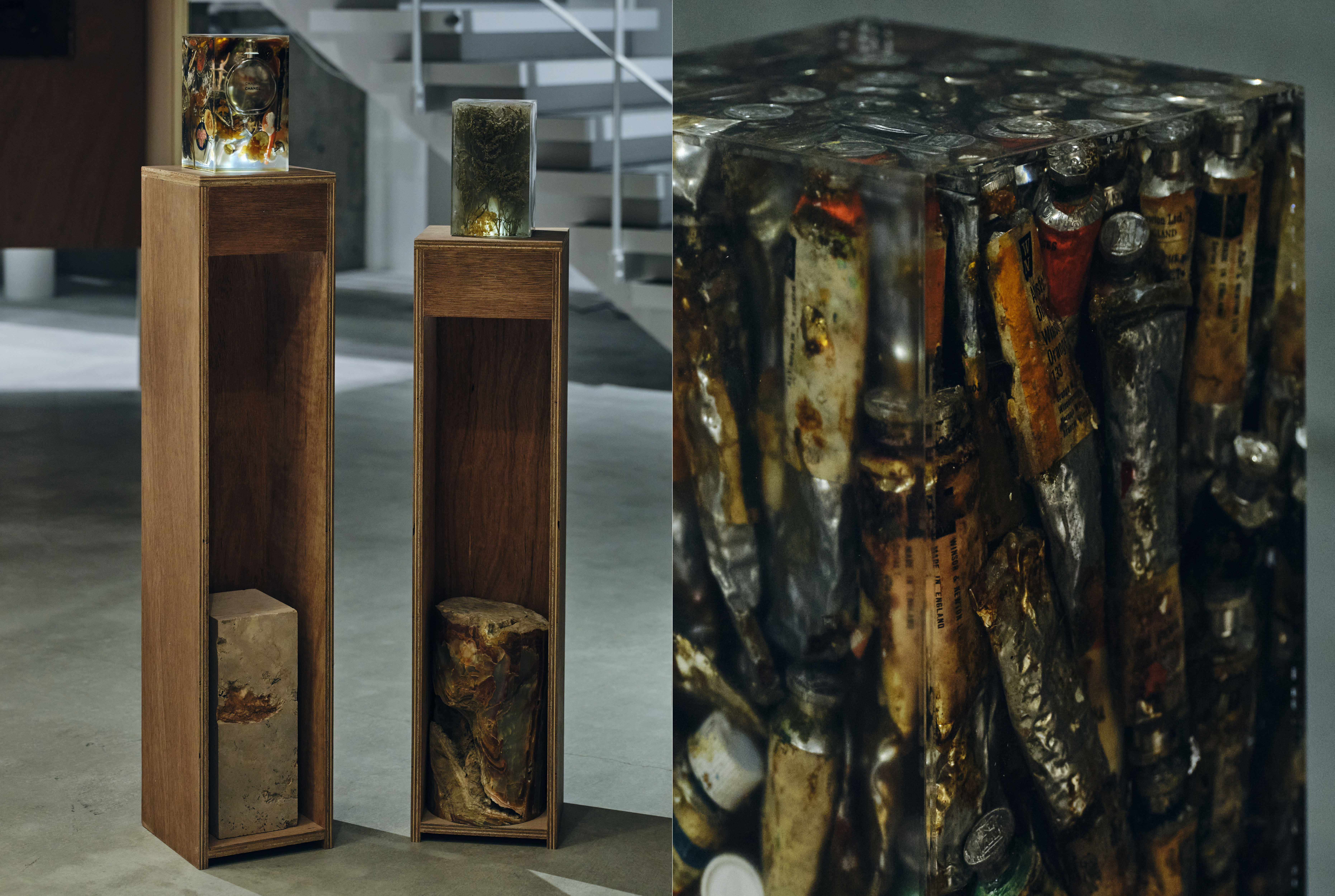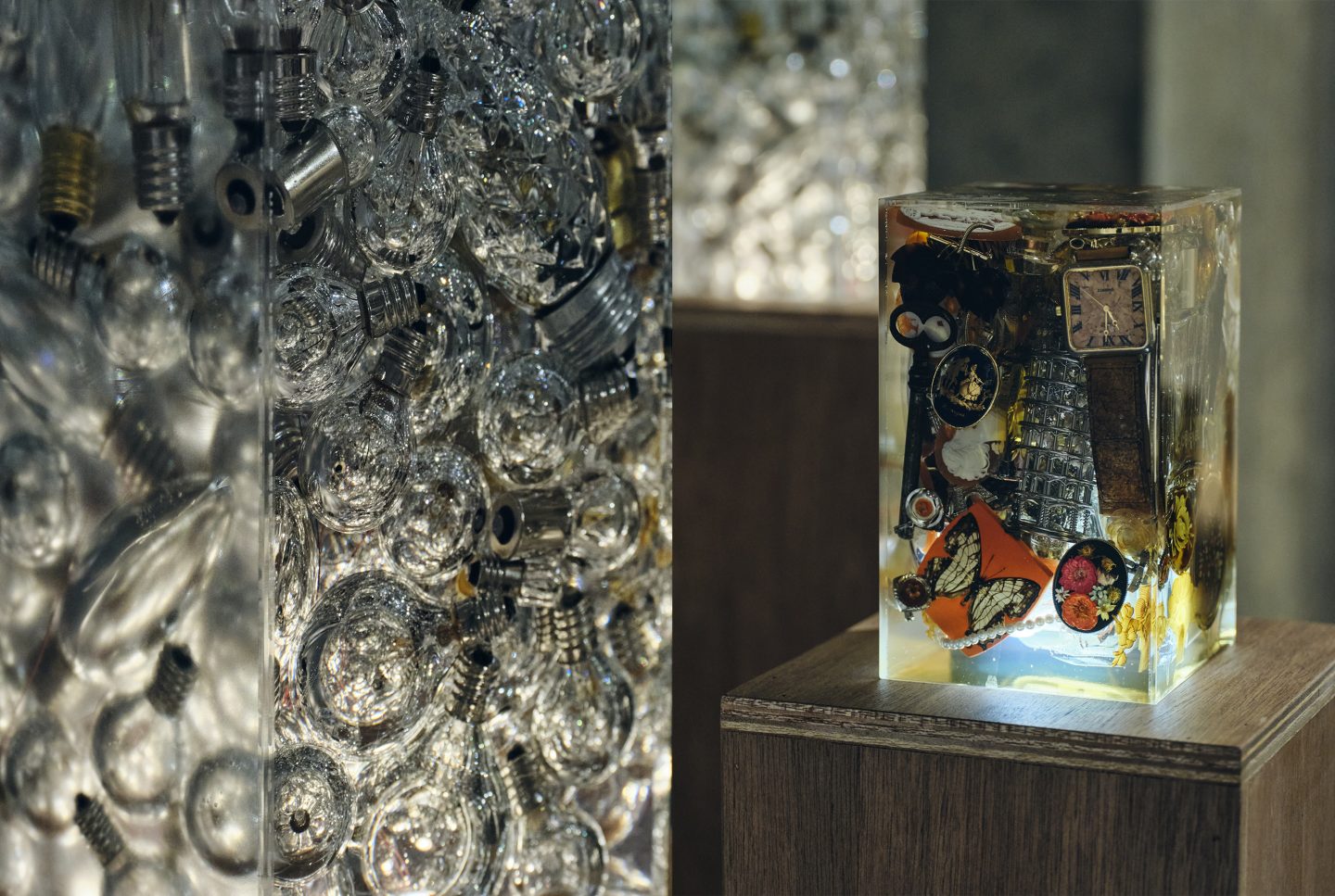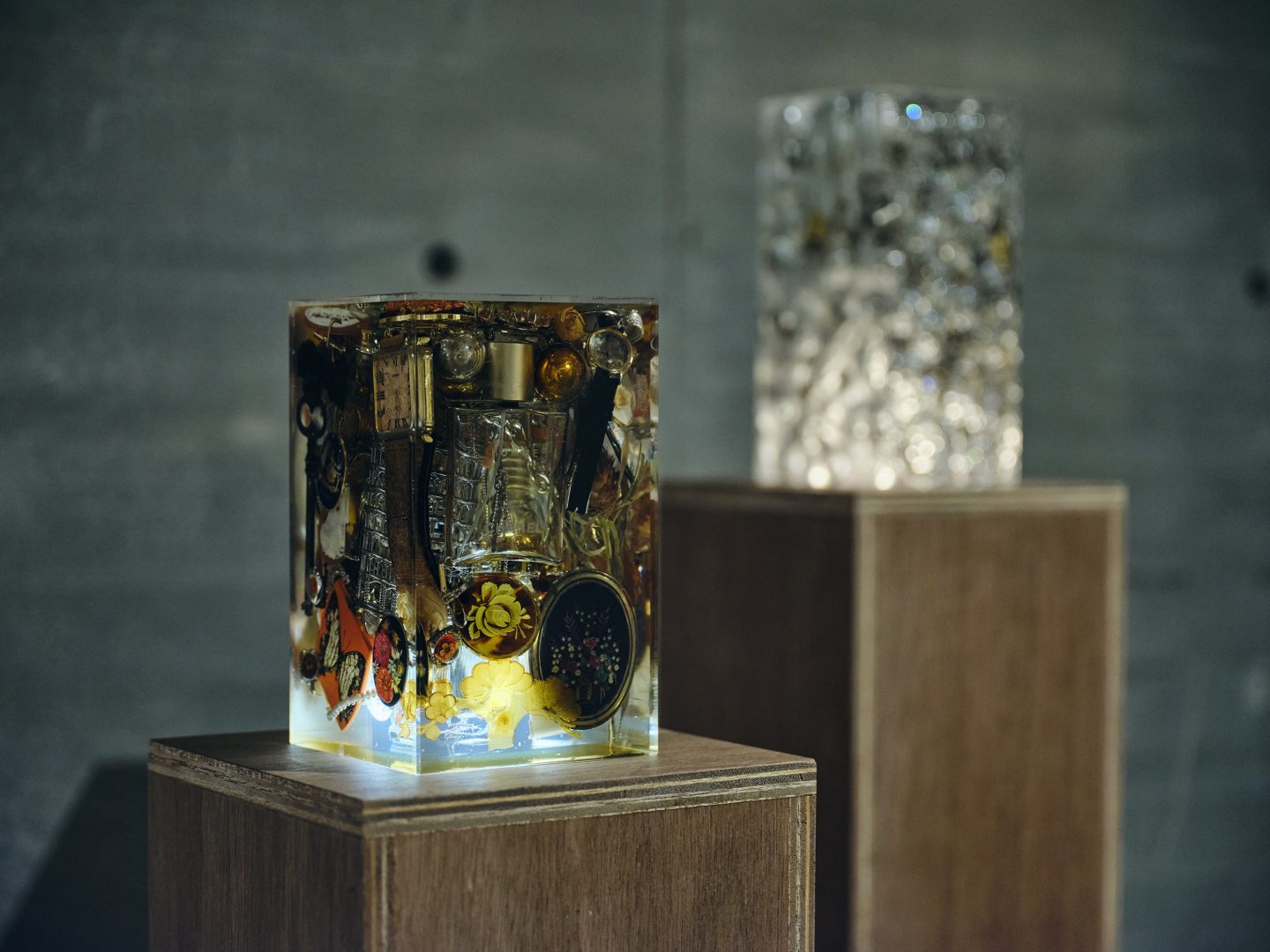 今ではほぼ使用しなくなった白熱球。これまで照らし続けていたものが、今回はアクリルの中で照らされる対象となって今もなお働き続けている。口金部分の鏡面が良い感じで隣り合う電球を写し込み、奥行きのある不思議な見た目の印象となった。その他に、アンティークマケットで収集していた小物を入れ込んだキューブやドライフラワー、絵の具のチューブなどのシリーズで制作。