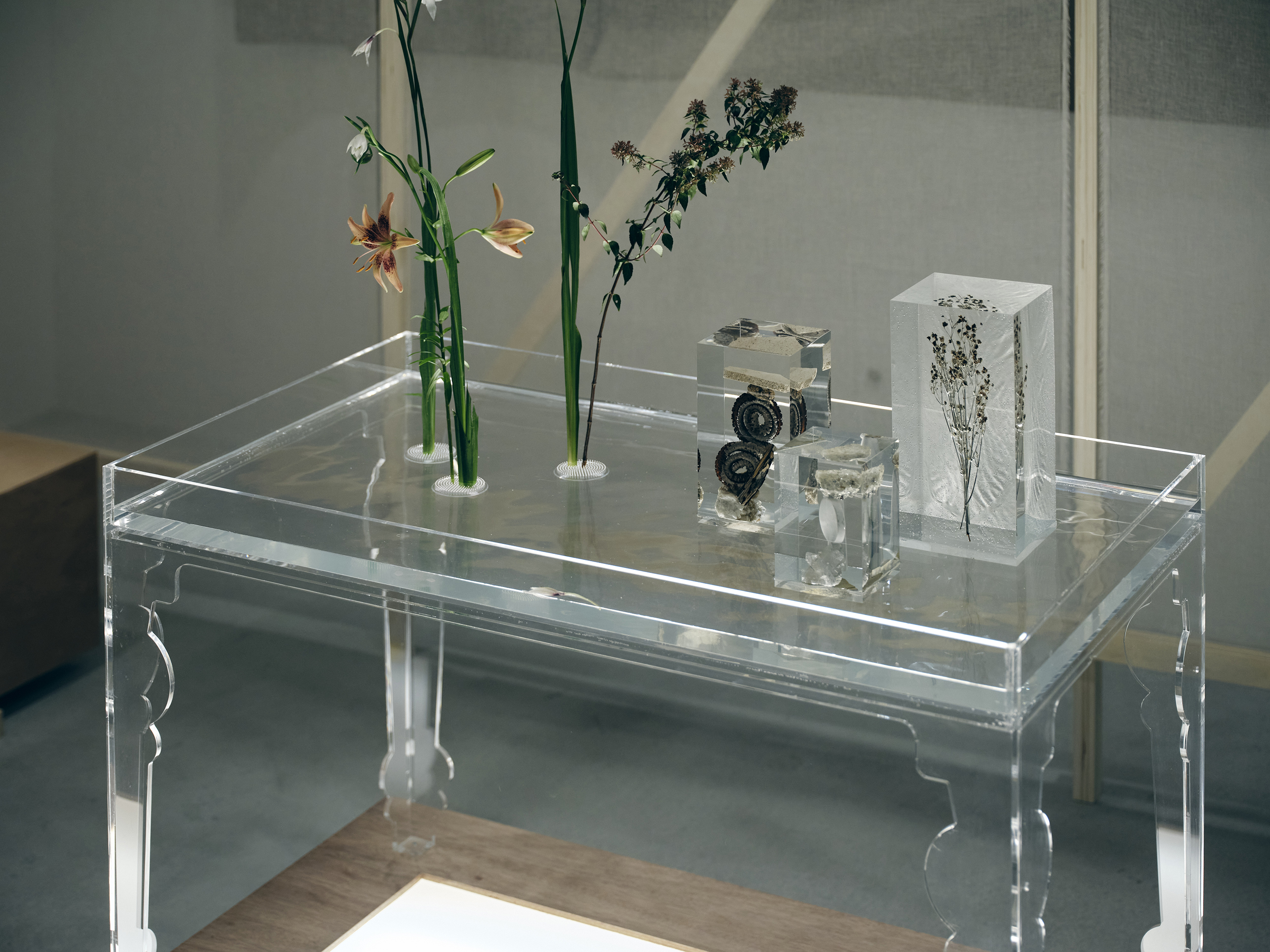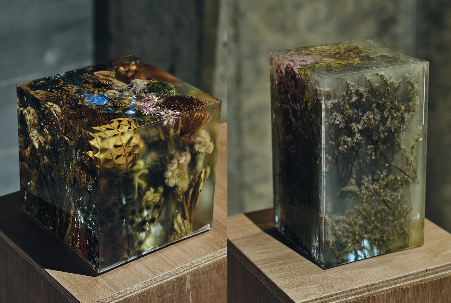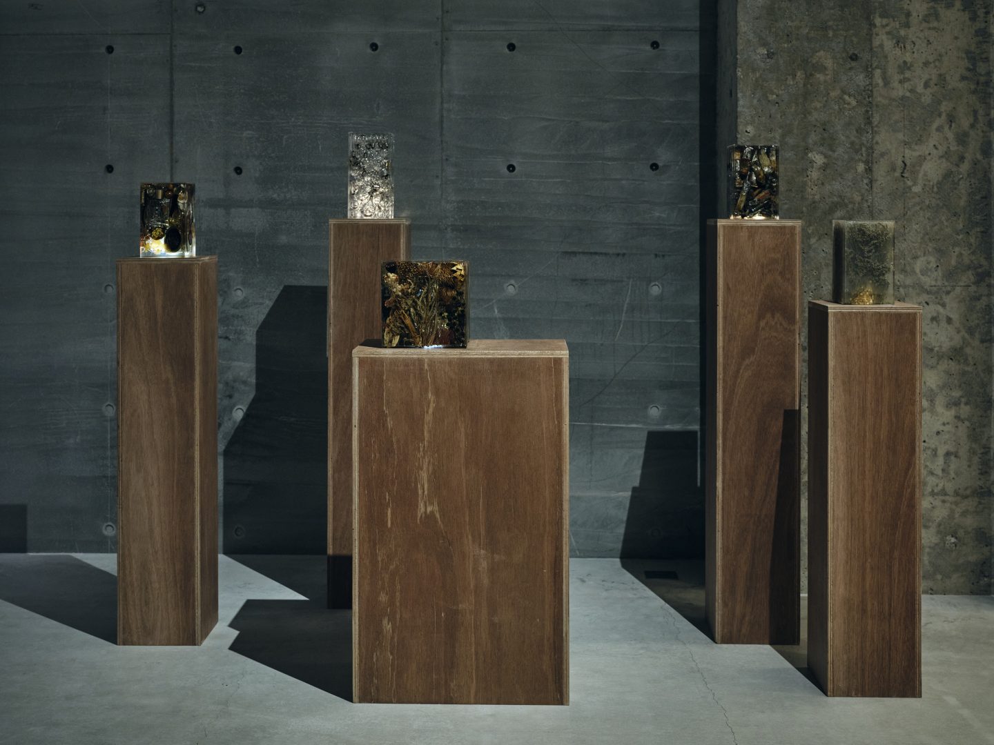 今ではほぼ使用しなくなった白熱球。これまで照らし続けていたものが、今回はアクリルの中で照らされる対象となって今もなお働き続けている。口金部分の鏡面が良い感じで隣り合う電球を写し込み、奥行きのある不思議な見た目の印象となった。その他に、アンティークマケットで収集していた小物を入れ込んだキューブやドライフラワー、絵の具のチューブなどのシリーズで制作。