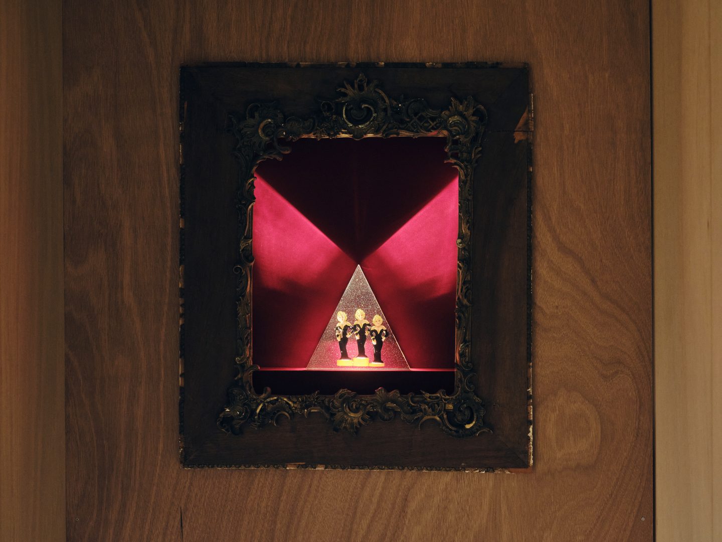 A frame with built-in lighting is embedded in the wall, displaying an acrylic artwork. Three Marilyn Monroe-like figures sing on stage within the acrylic, showered in glitter. It’s the kind of piece that makes you think, “What is this?” Yet it is one complete work, encompassing the acrylic interior, the outer frame, and the large box itself. Taking up this much space, yet displaying only a single piece. A luxurious Marilyn Monroe. That empty space was crucial this time.