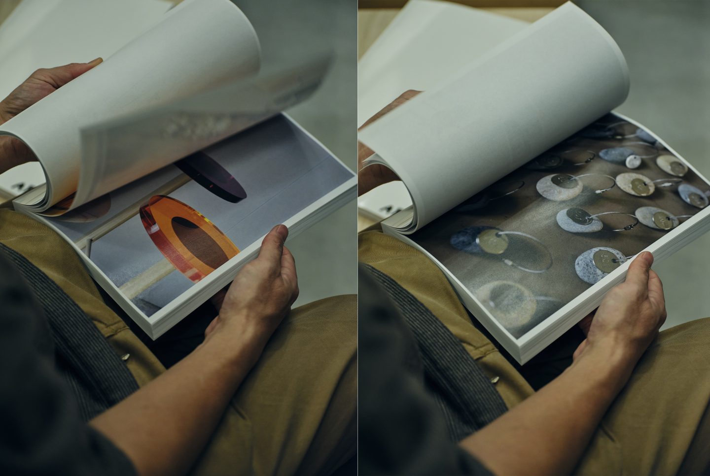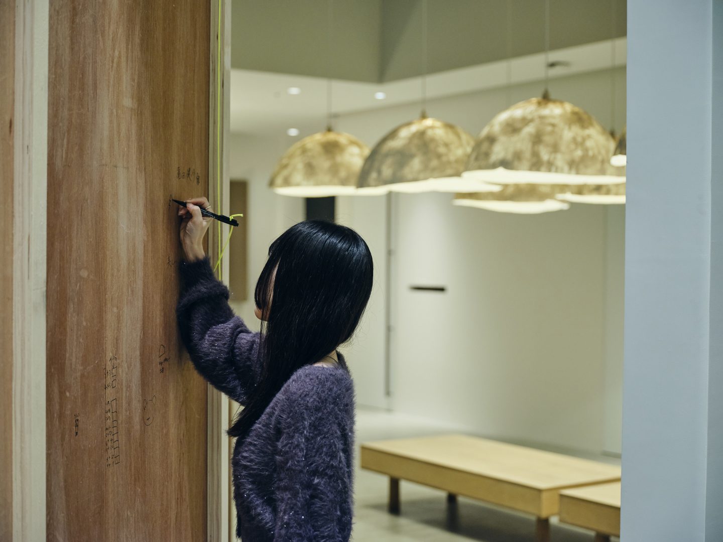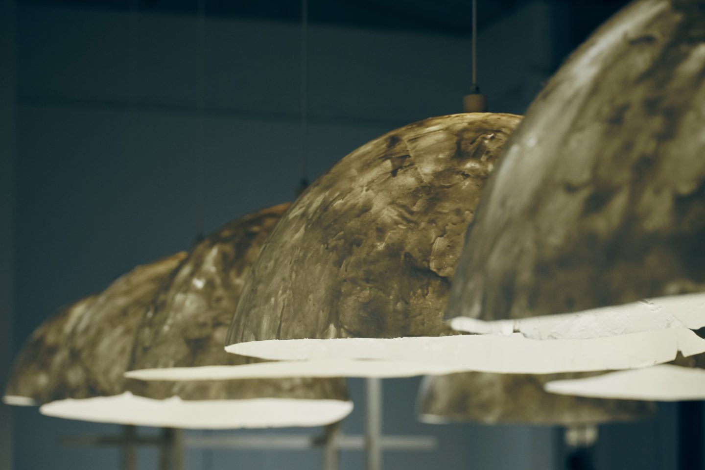 The lampshades suspended from the approximately 4-meter ceiling are large, φ750mm glass fiber shades. The thickness of the fibers creates uneven light leakage, giving them a moonlike appearance. This time, ten lamps were hung, and benches were placed beneath them for visitors to browse the three prepared collections of works. Since the venue’s flow involved descending stairs, the intention was for visitors to look up at these large lampshades.