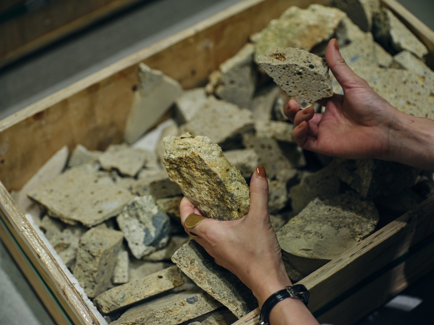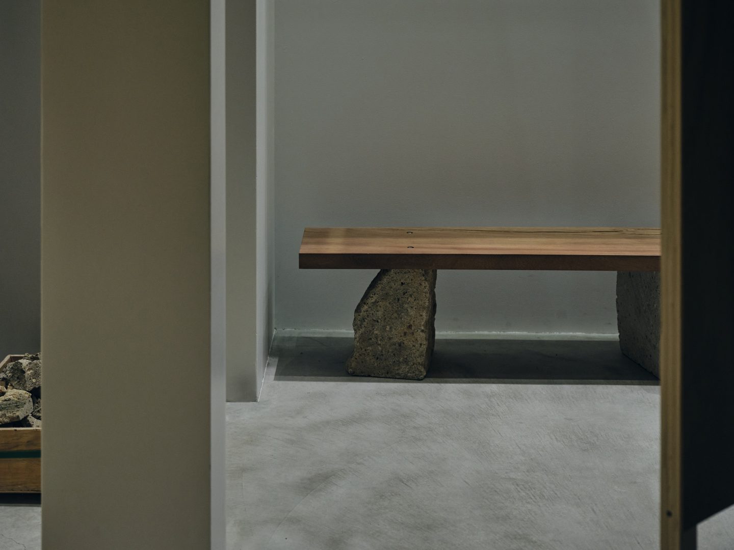 展示台として制作した角柱は220角とスリムだったため念の為の安定感を確保するために、邪魔にならない背面を開口し、オニキスや大理石のブロックを入れてウェイトとして使用した。石ってこう使うのが一番理にかなっているよなぁと、石の使い方を常日頃から考えていて、プロダクトを色々作っているのだが、今回の使用方法にこれなんだなと納得してしまった。