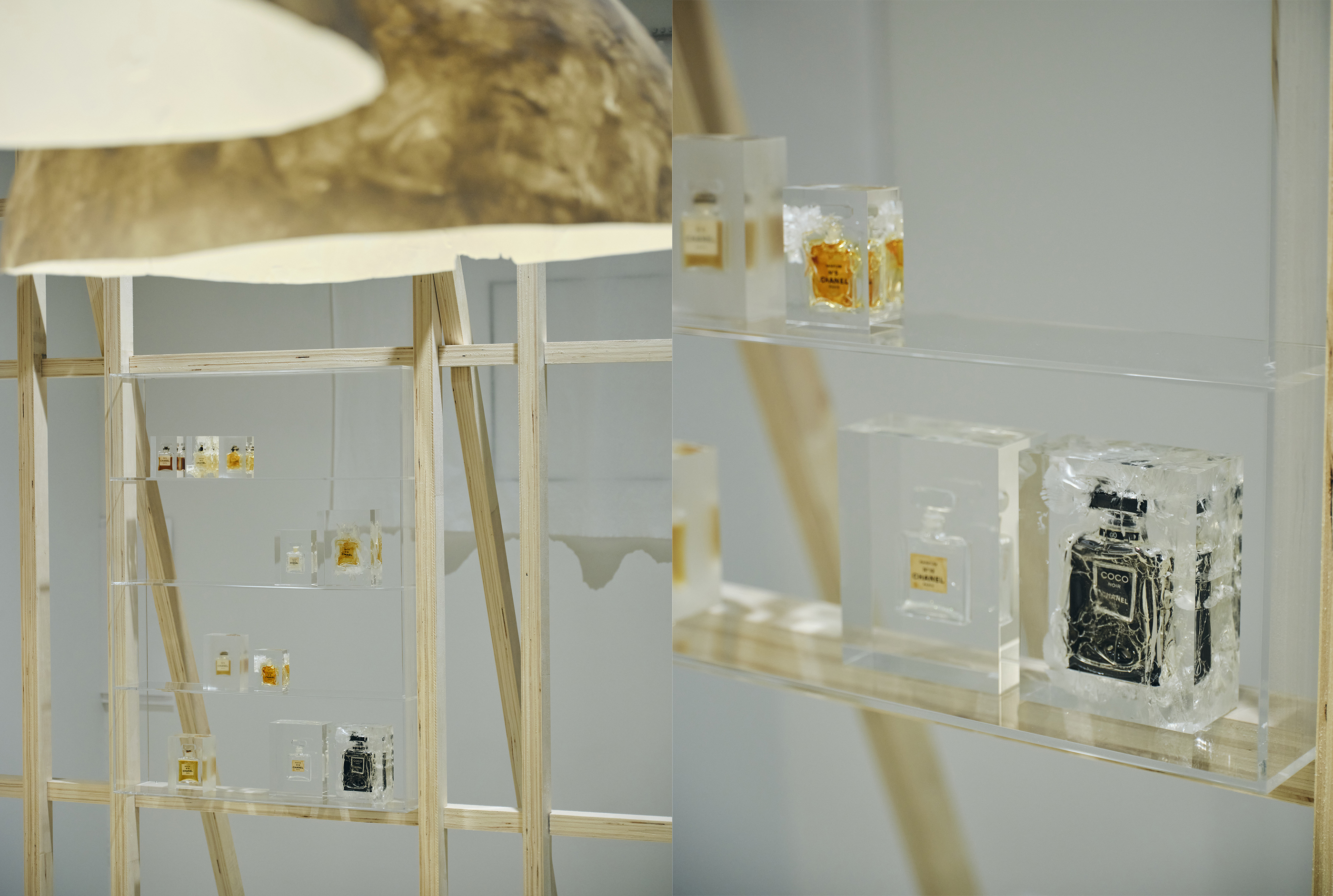 ラワンで作った角柱に光源を入れ込み、配線が見えないような展示什器を制作。アクリル作品の新たなシリーズである詰め込みスタイルのシリーズを展示。今回の展示は、美しいとは何か?ということを念頭に置いて空間演出を考えた。ラワンベニヤのコグチ(ふち)が見えるような組み方をしているのも、あえてそれを見せるために狙ってやっている。きれいにノイズをなくすことだけが美しいのではない。