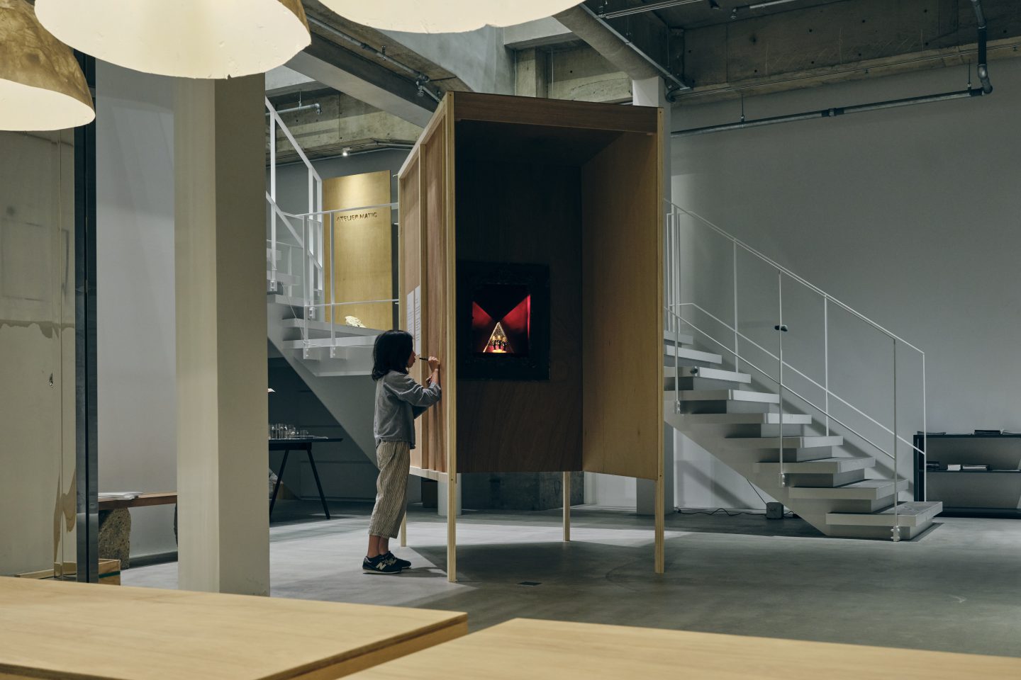 再開発が活発に行われている日本橋兜町。設計施工を行う白水社のギャラリースペースにてAtelier maticの展示を行った。これまでに制作してきたアクリル作品に加えて新たなアクリル作品数点、大きなランプシェードなどを展示したが、今回は空間演出に力を入れて、どこまでが作品なのか、こ、こ、これはこの空間全体が作品なのではないか!という展示にチャレンジした。