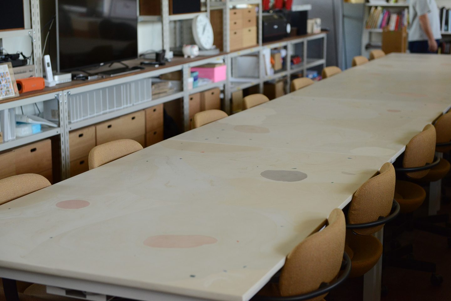 Production of an office table for a creative studio housing video artists and designers. A large table spanning 7 meters in length. Designed with an abstract-like pattern while maintaining a color tone that avoids distracting during actual work.