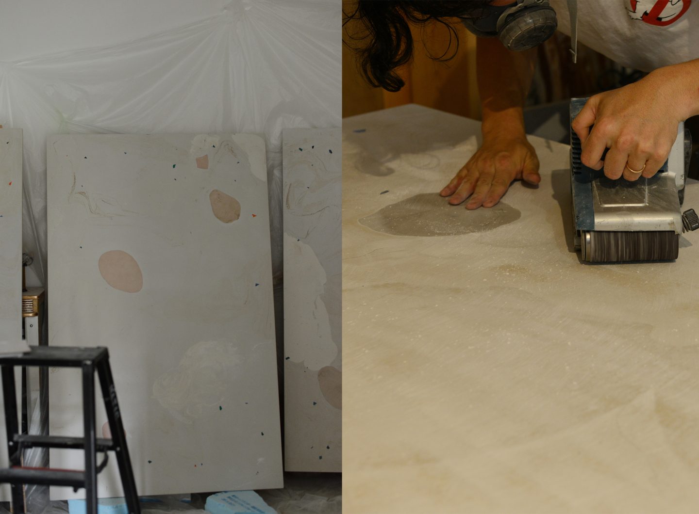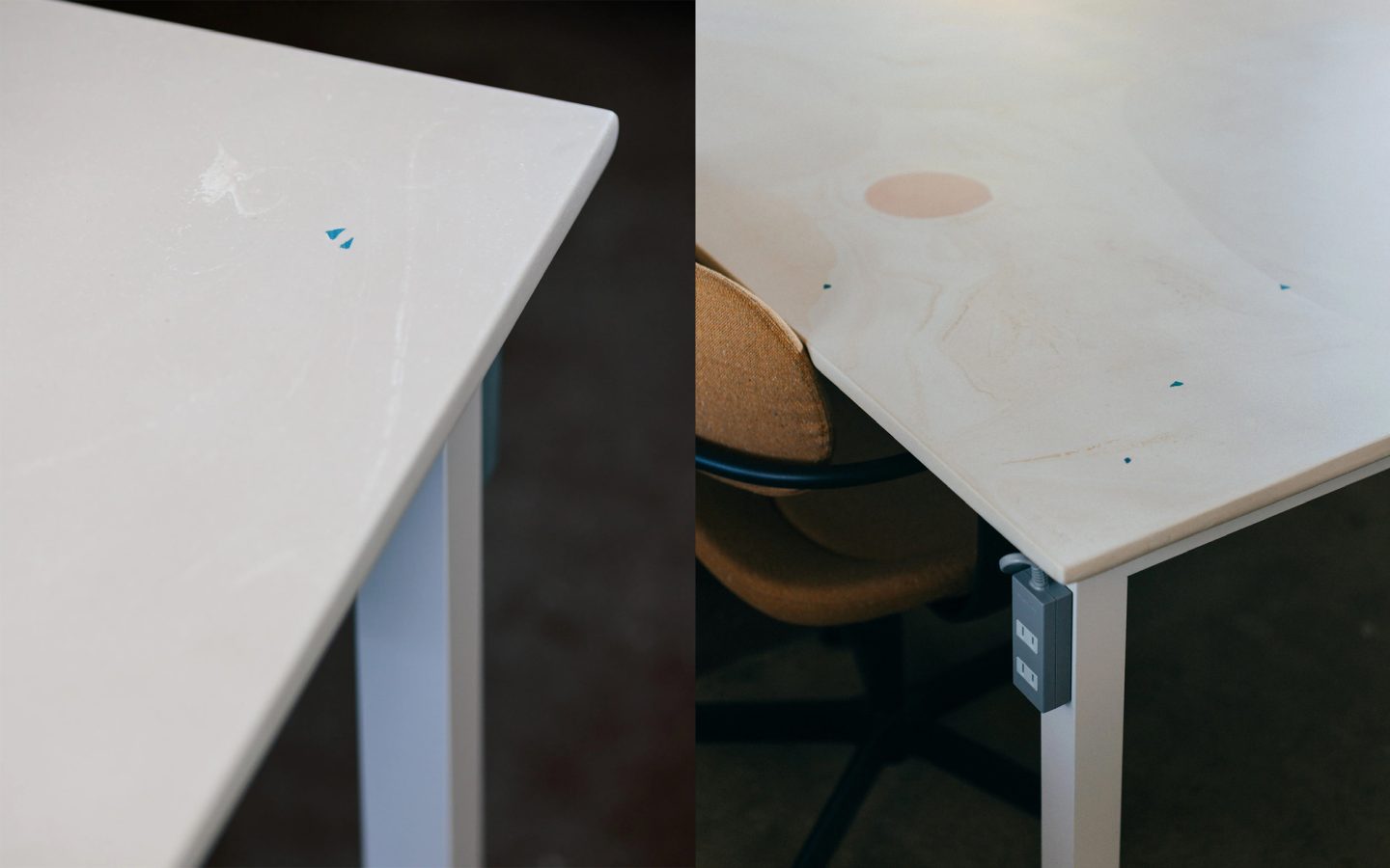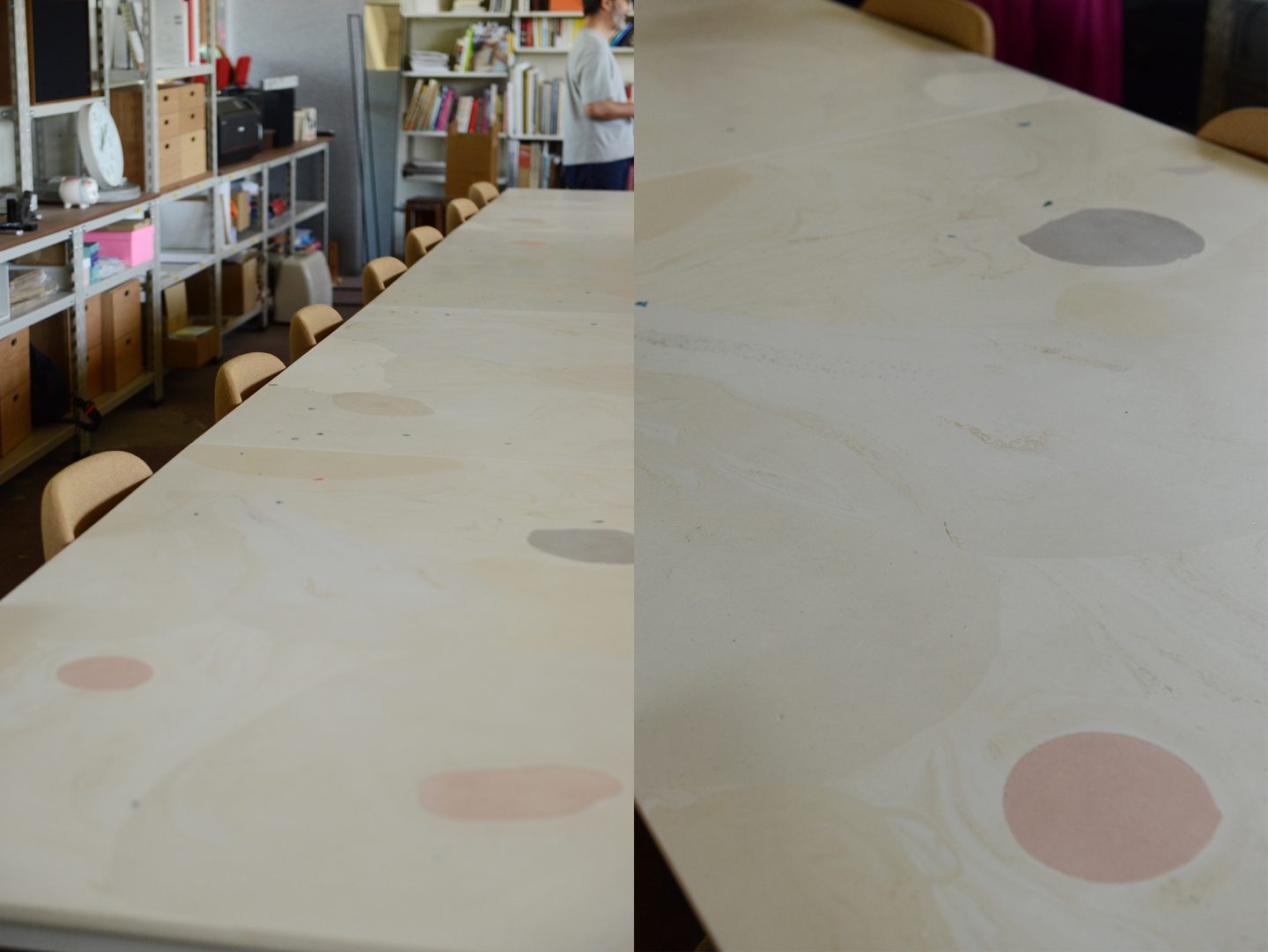 映像やデザイナーが所属するクリエイティブスタジオのオフィステーブルの制作。全長7mに及ぶ大きなテーブル。抽象画のような模様で構成をしつつも実作業で邪魔にならないような色のトーンで構成した。
